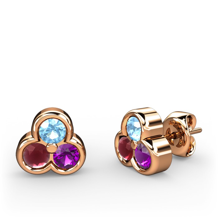 Akuamarin, kök yakut ve ametist 18 ayar rose altın küpe