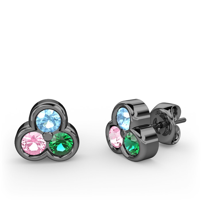 Akuamarin, pembe kuvars ve yeşil kuvars 925 ayar siyah rodyum kaplama gümüş küpe