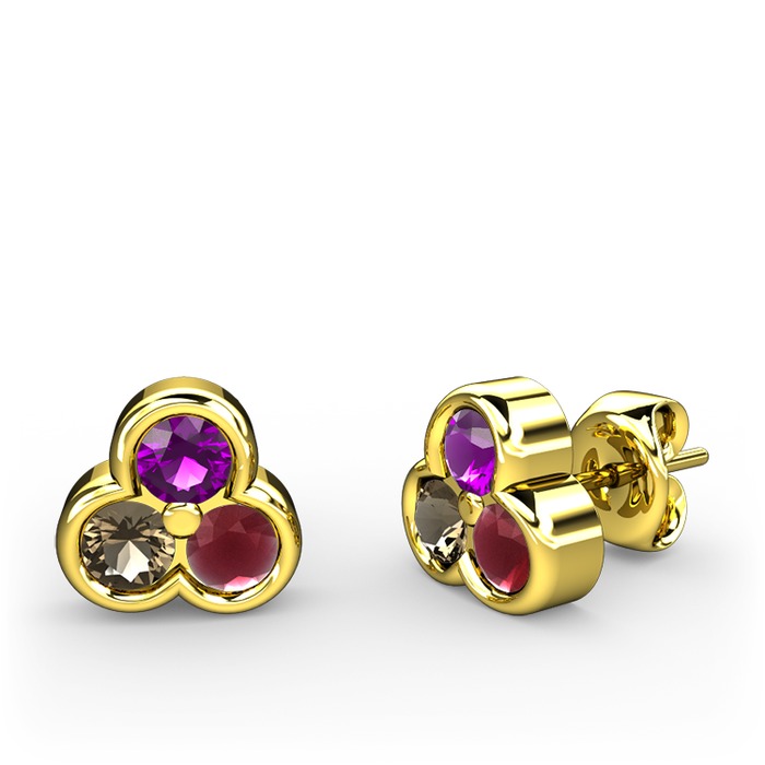 Ametist, dumanlı kuvars ve kök yakut 8 ayar altın küpe