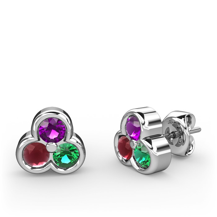 Ametist, kök yakut ve yeşil kuvars 18 ayar beyaz altın küpe