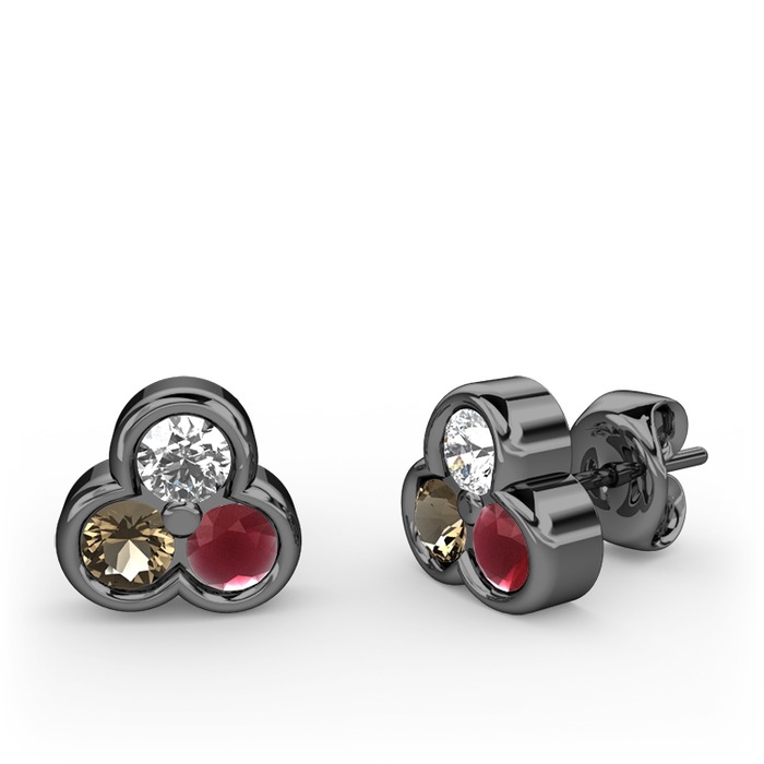 Beyaz zirkon, dumanlı kuvars ve kök yakut 925 ayar siyah rodyum kaplama gümüş küpe