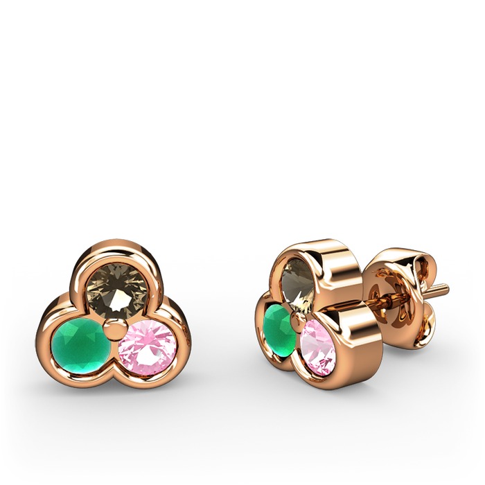 Dumanlı kuvars, kök zümrüt ve pembe kuvars 14 ayar rose altın küpe