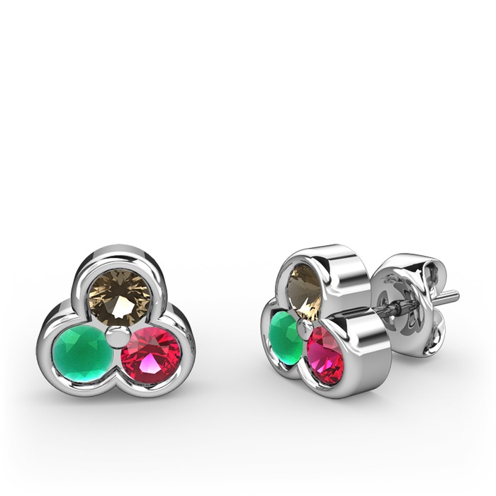 Dumanlı kuvars, kök zümrüt ve rodolit garnet 14 ayar beyaz altın küpe
