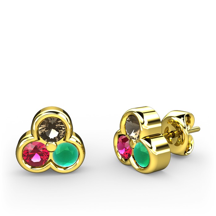 Dumanlı kuvars, rodolit garnet ve kök zümrüt 18 ayar altın küpe