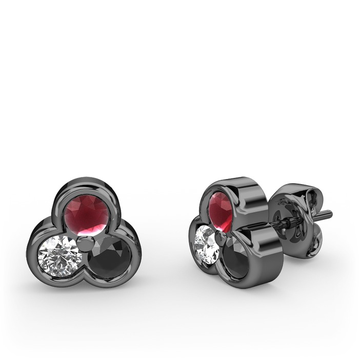 Kök yakut, beyaz zirkon ve siyah zirkon 925 ayar siyah rodyum kaplama gümüş küpe