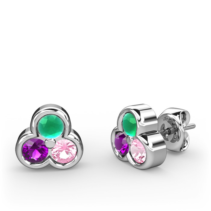 Kök zümrüt, ametist ve pembe kuvars 8 ayar beyaz altın küpe