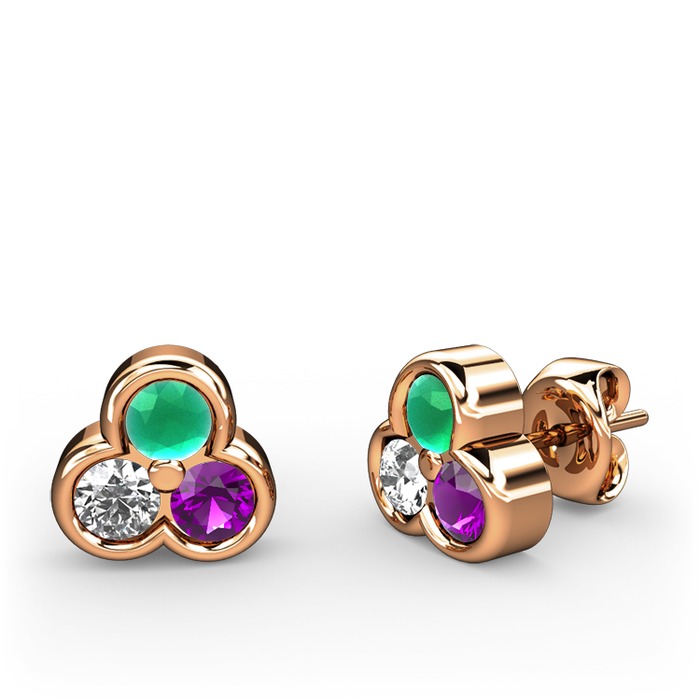 Kök zümrüt, beyaz zirkon ve ametist 18 ayar rose altın küpe
