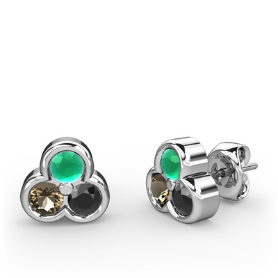Kök zümrüt, dumanlı kuvars ve siyah zirkon 14 ayar beyaz altın küpe