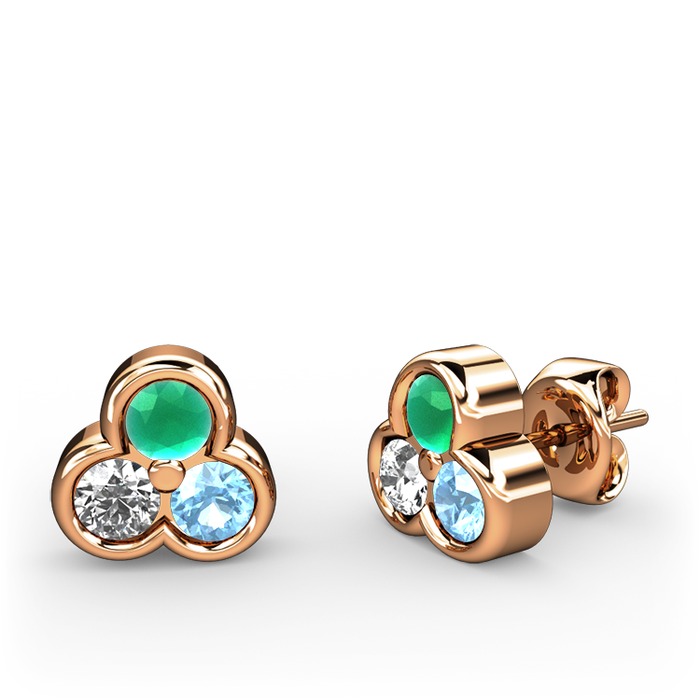 Kök zümrüt, pırlanta ve akuamarin 18 ayar rose altın küpe (0.22 karat)