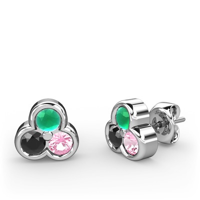 Kök zümrüt, siyah zirkon ve pembe kuvars 14 ayar beyaz altın küpe
