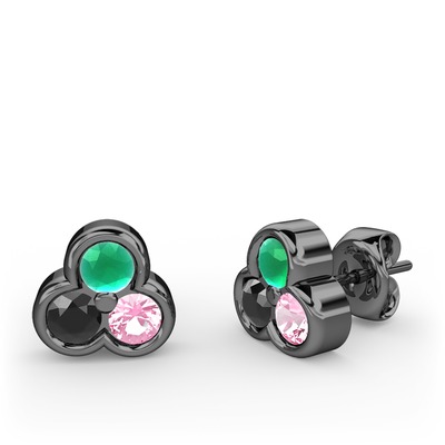 Kök zümrüt, siyah zirkon ve pembe kuvars 925 ayar siyah rodyum kaplama gümüş küpe