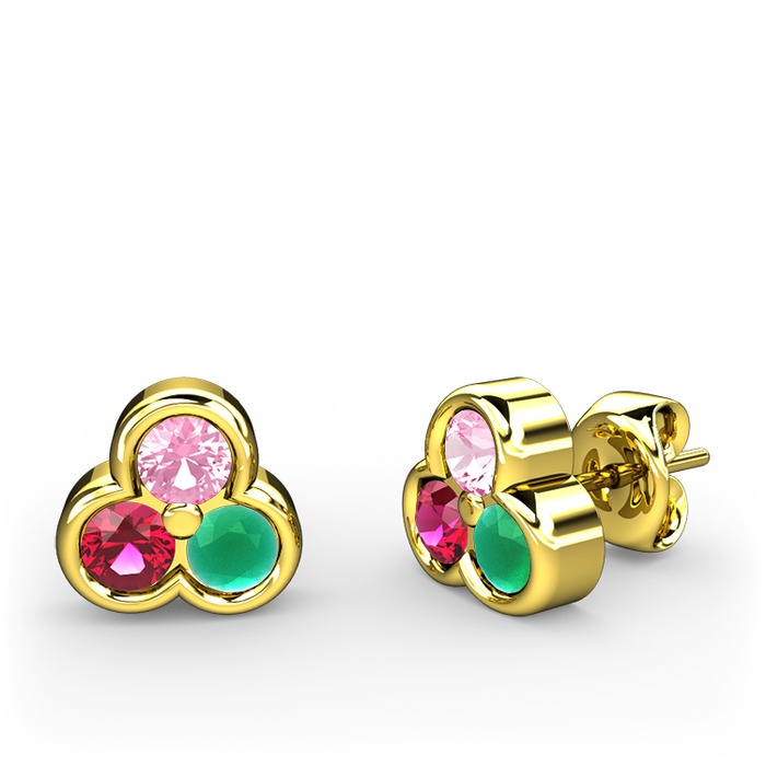 Pembe kuvars, rodolit garnet ve kök zümrüt 18 ayar altın küpe