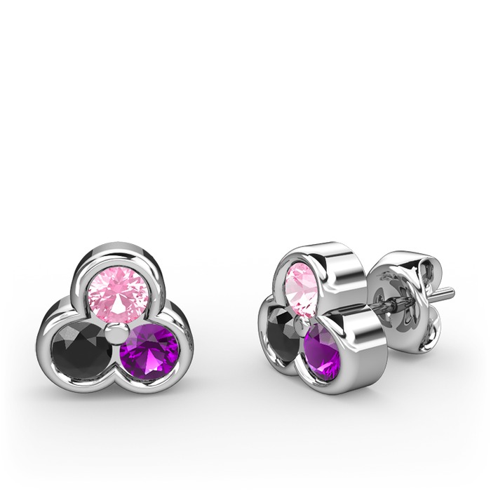 Pembe kuvars, siyah zirkon ve ametist 14 ayar beyaz altın küpe