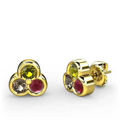 Peridot, dumanlı kuvars ve kök yakut 8 ayar altın küpe
