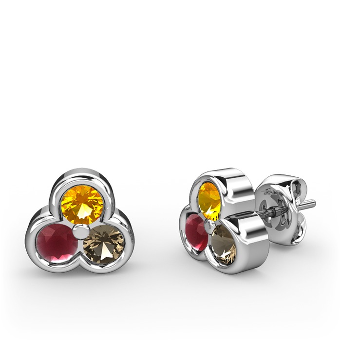 Sitrin, kök yakut ve dumanlı kuvars 8 ayar beyaz altın küpe