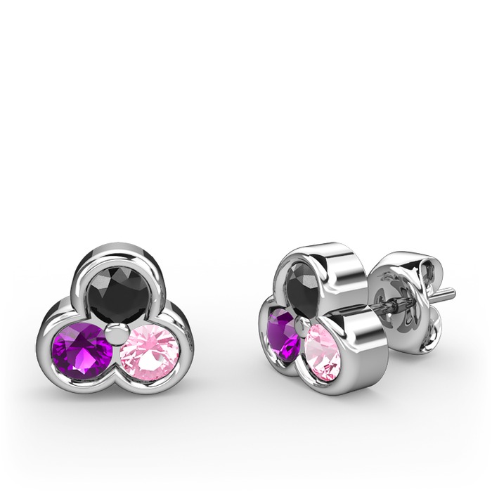 Siyah zirkon, ametist ve pembe kuvars 18 ayar beyaz altın küpe