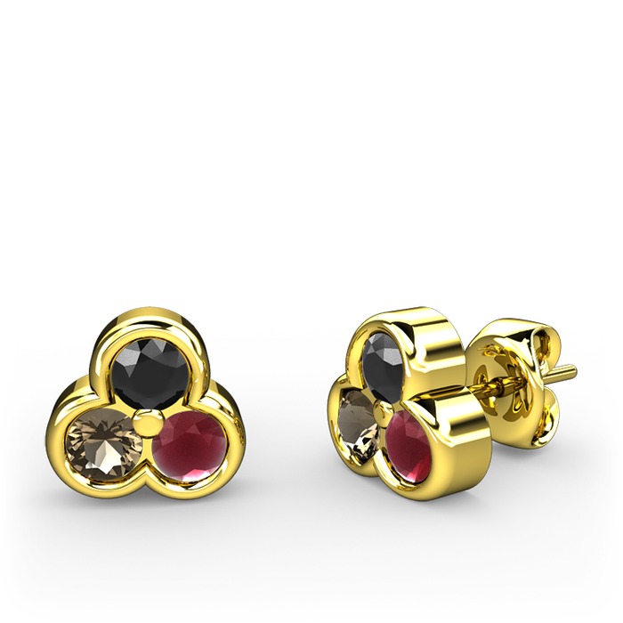 Siyah zirkon, dumanlı kuvars ve kök yakut 14 ayar altın küpe