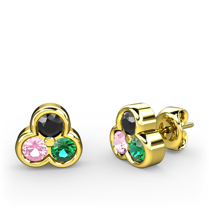Siyah zirkon, pembe kuvars ve yeşil kuvars 18 ayar altın küpe