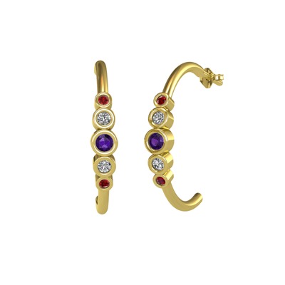 Ametist, beyaz zirkon ve garnet 18 ayar altın küpe