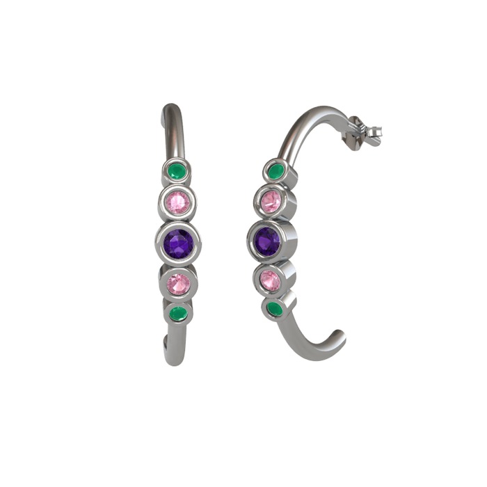 Ametist, pembe kuvars ve kök zümrüt 18 ayar beyaz altın küpe