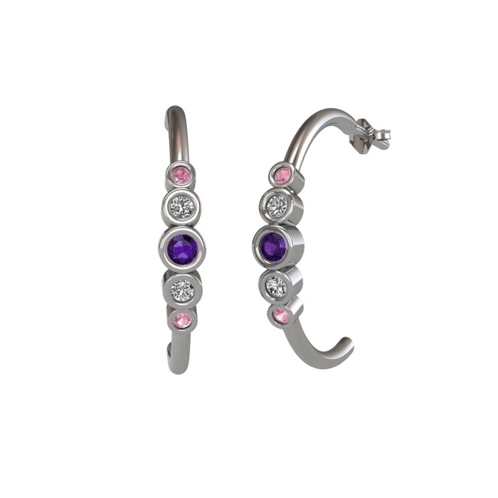 Ametist, swarovski ve pembe kuvars 14 ayar beyaz altın küpe