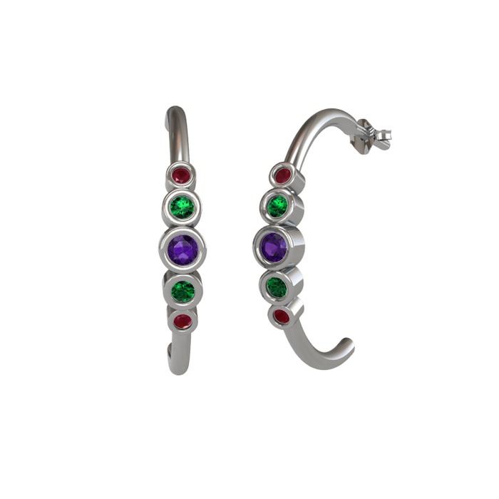 Ametist, yeşil kuvars ve kök yakut 8 ayar beyaz altın küpe