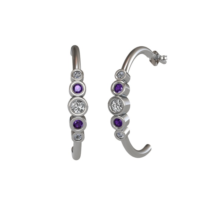 Beyaz zirkon, ametist ve pırlanta 8 ayar beyaz altın küpe (0.08 karat)