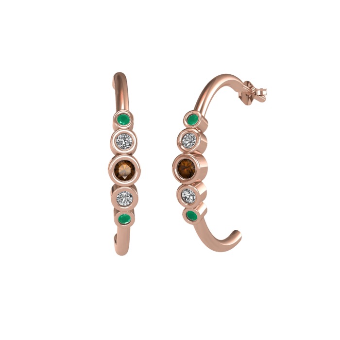 Dumanlı kuvars, swarovski ve kök zümrüt 8 ayar rose altın küpe