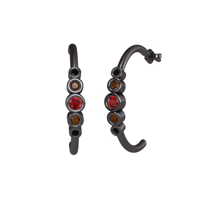 Garnet, dumanlı kuvars ve siyah zirkon 925 ayar siyah rodyum kaplama gümüş küpe