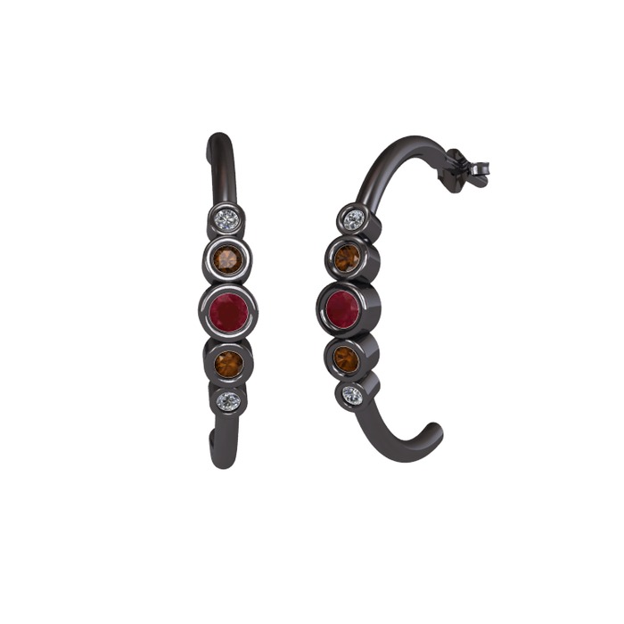 Kök yakut, dumanlı kuvars ve pırlanta 925 ayar siyah rodyum kaplama gümüş küpe (0.08 karat)