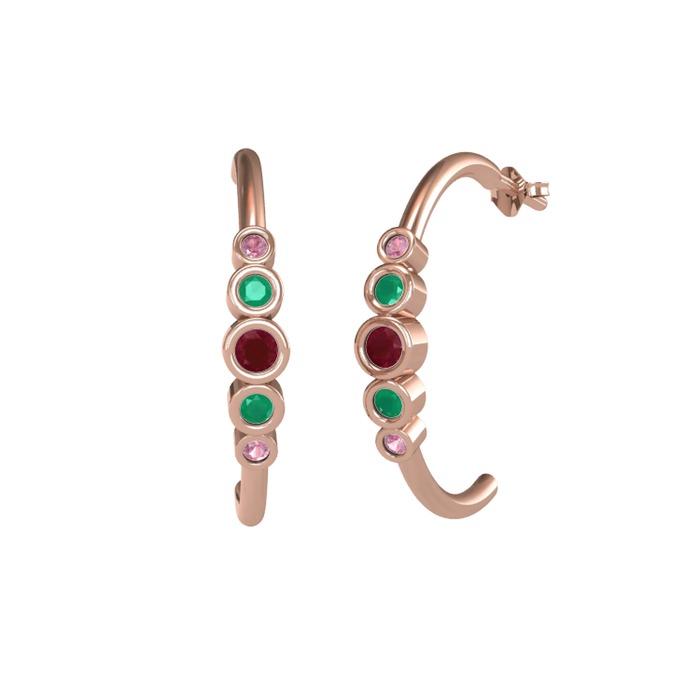 Kök yakut, kök zümrüt ve pembe kuvars 8 ayar rose altın küpe