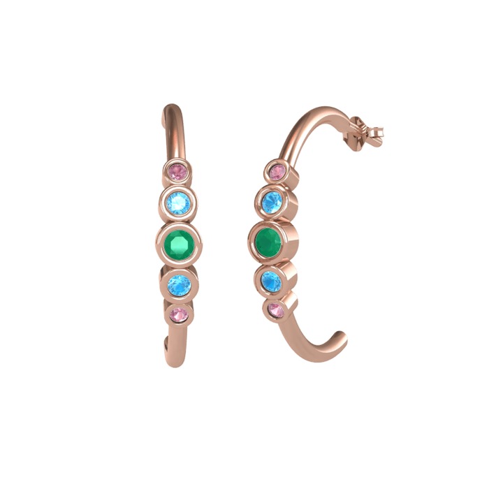 Kök zümrüt, akuamarin ve pembe kuvars 8 ayar rose altın küpe