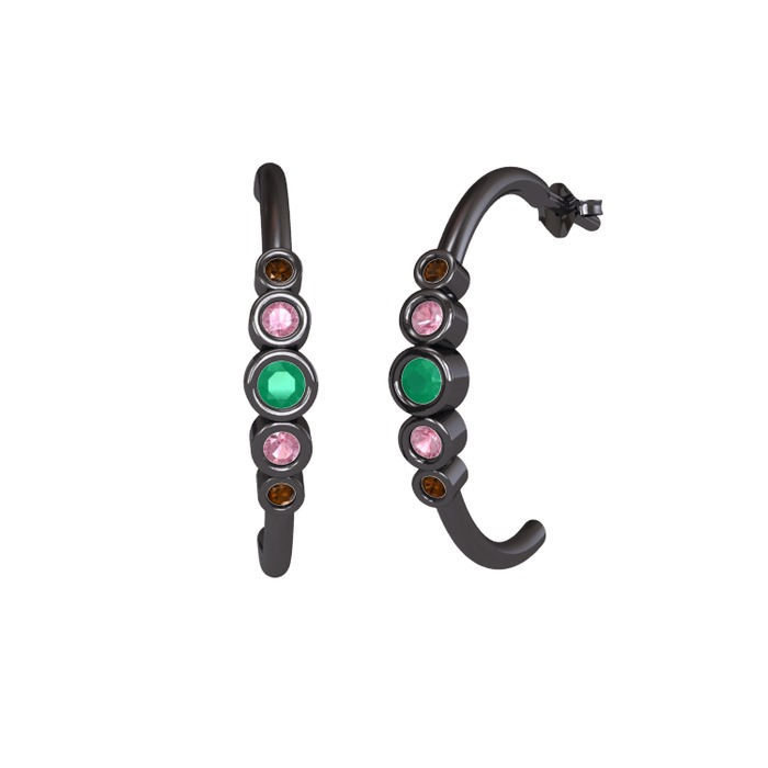 Kök zümrüt, pembe kuvars ve dumanlı kuvars 925 ayar siyah rodyum kaplama gümüş küpe