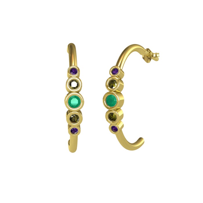 Kök zümrüt, peridot ve ametist 8 ayar altın küpe