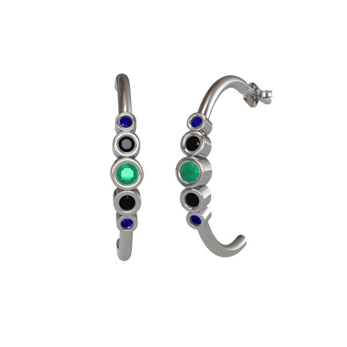 Kök zümrüt, siyah zirkon ve lab safir 8 ayar beyaz altın küpe