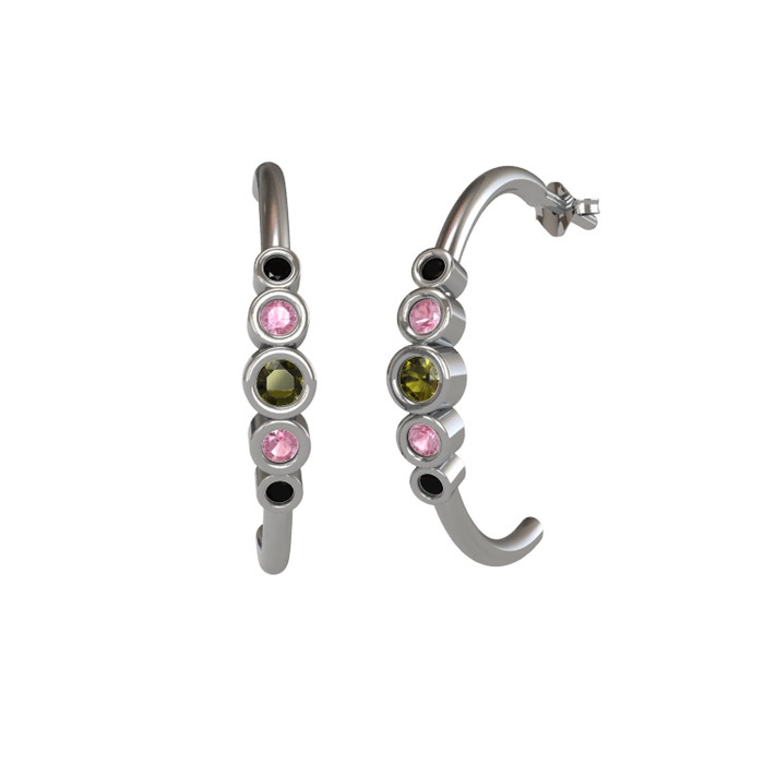 Peridot, pembe kuvars ve siyah zirkon 14 ayar beyaz altın küpe