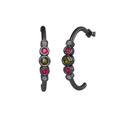 Peridot, rodolit garnet ve pırlanta 925 ayar siyah rodyum kaplama gümüş küpe (0.08 karat)