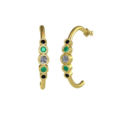 Pırlanta, kök zümrüt ve siyah zirkon 18 ayar altın küpe (0.12 karat)