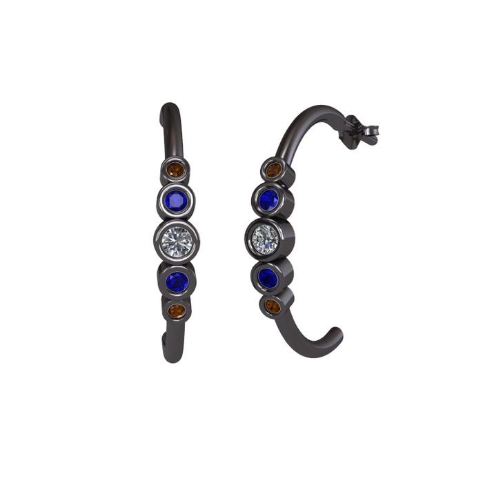 Pırlanta, lab safir ve dumanlı kuvars 925 ayar siyah rodyum kaplama gümüş küpe (0.12 karat)