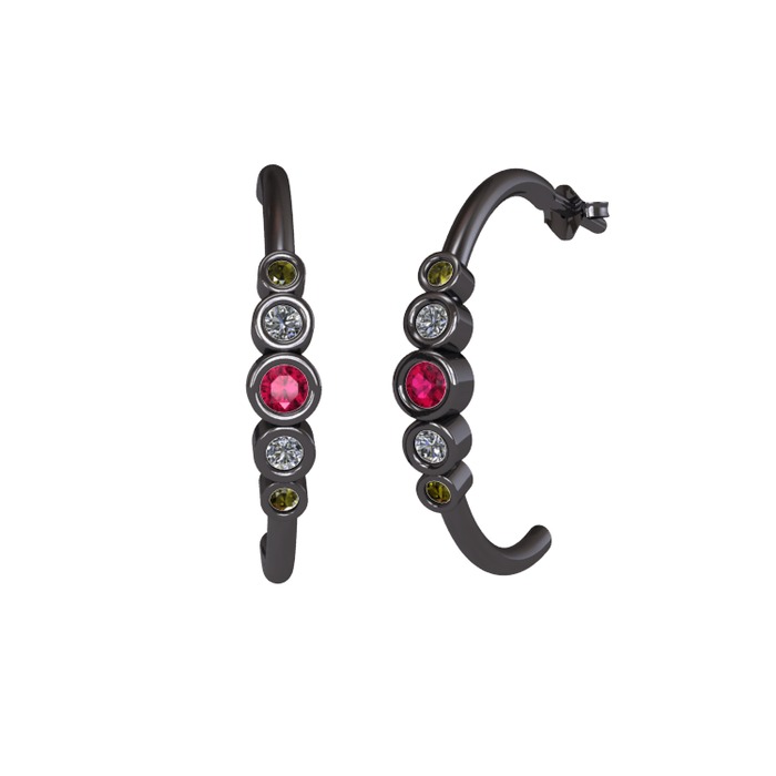 Rodolit garnet, pırlanta ve peridot 925 ayar siyah rodyum kaplama gümüş küpe (0.08 karat)