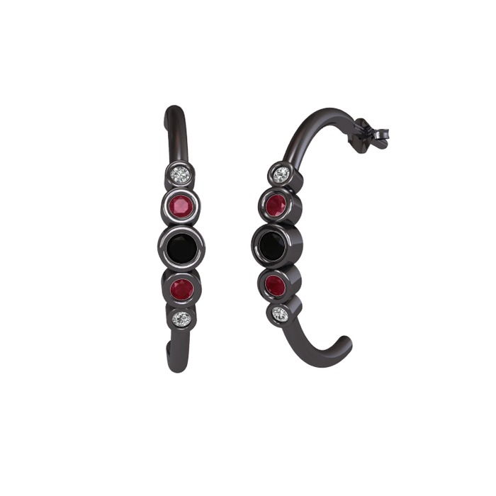 Siyah zirkon, kök yakut ve beyaz zirkon 925 ayar siyah rodyum kaplama gümüş küpe