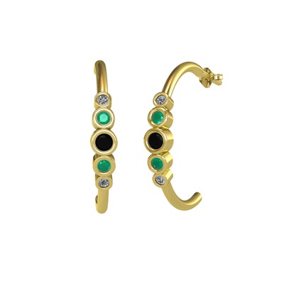 Siyah zirkon, kök zümrüt ve pırlanta 8 ayar altın küpe (0.08 karat)