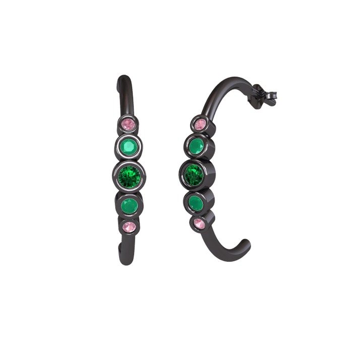 Yeşil kuvars, kök zümrüt ve pembe kuvars 925 ayar siyah rodyum kaplama gümüş küpe