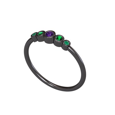 Ametist, yeşil kuvars ve kök zümrüt 925 ayar siyah rodyum kaplama gümüş yüzük