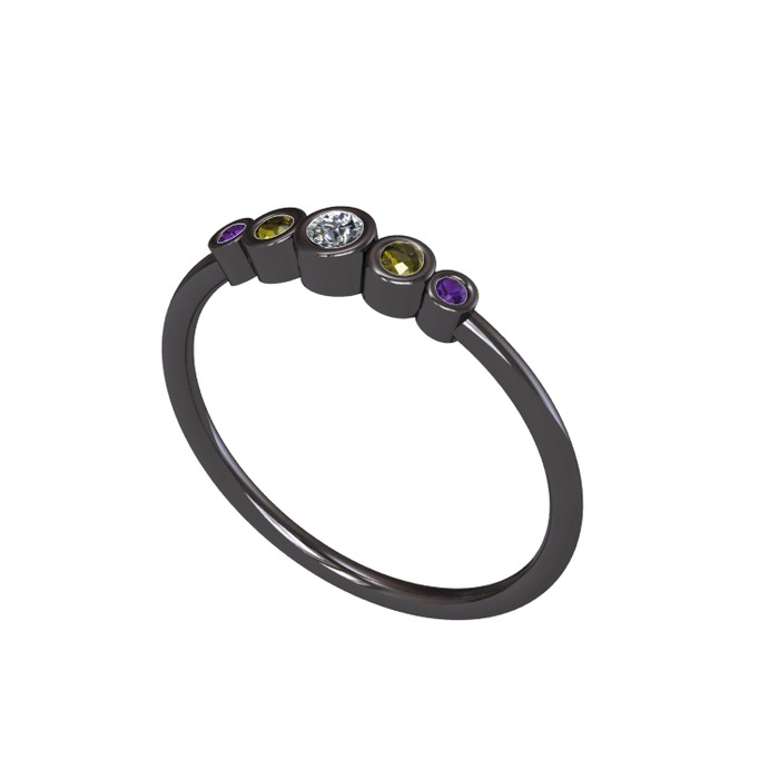 Elmas, peridot ve ametist 925 ayar siyah rodyum kaplama gümüş yüzük (0.06 karat)