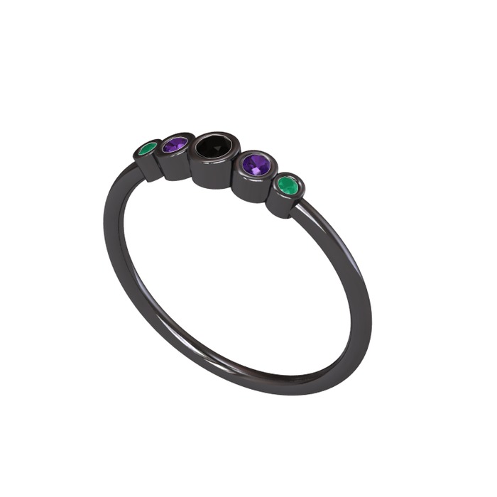 Siyah zirkon, ametist ve kök zümrüt 925 ayar siyah rodyum kaplama gümüş yüzük