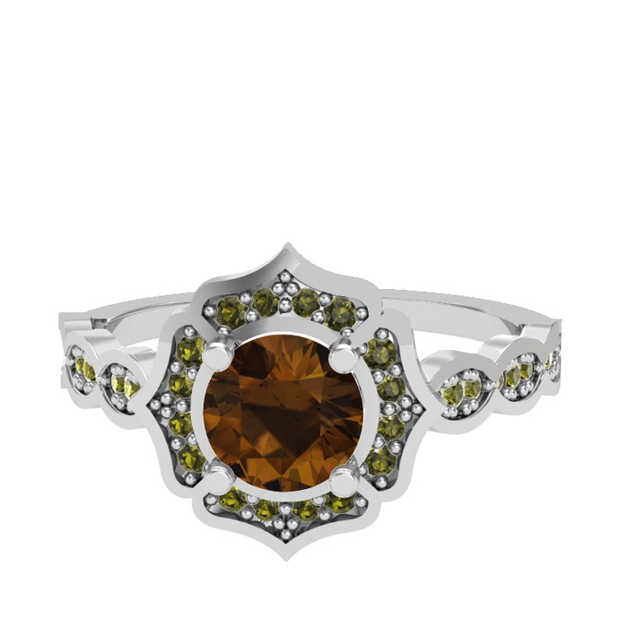 Dumanlı kuvars ve peridot 8 ayar beyaz altın yüzük