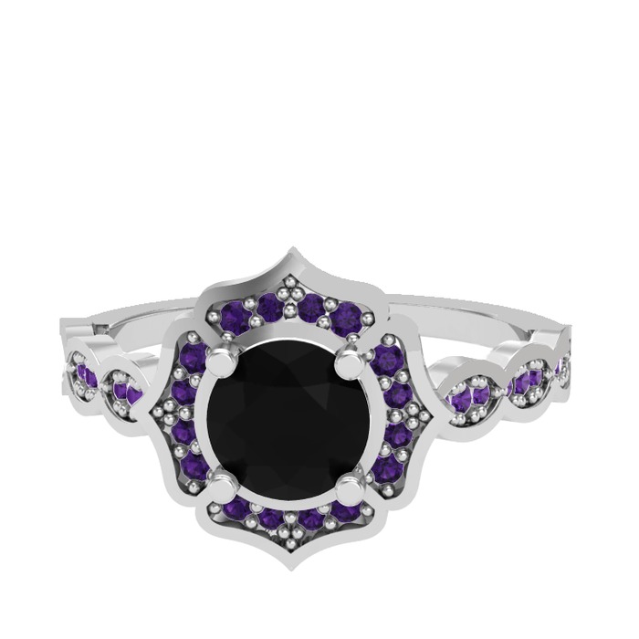 Siyah zirkon ve ametist 14 ayar beyaz altın yüzük