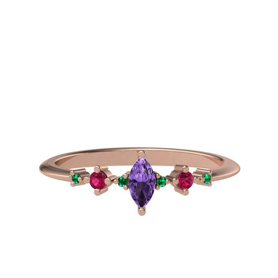 Ametist, rodolit garnet ve yeşil kuvars 14 ayar rose altın yüzük