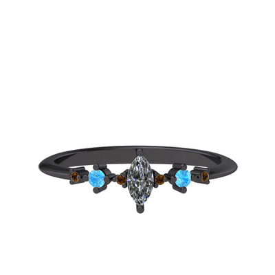 Beyaz zirkon, akuamarin ve dumanlı kuvars 925 ayar siyah rodyum kaplama gümüş yüzük